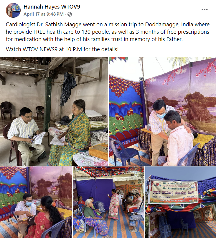 Our thanks to WTOV 9 and reporter Hannah Hayes for featuring Trinity Health System cardiologist Dr. Sathish Magge on their newscast this week. Recently, Dr. Magge went on a mission trip to Doddamagge, India, where he provided free healthcare to 130 indigent people, plus three months of free scripts for medication they needed.